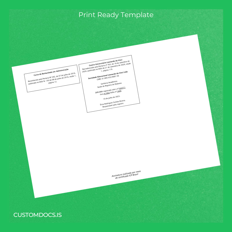 The Brazil Centro Universitário Leonardo da Vinci Bachelor of Science in Administration Template – Word & PDF offers a complete, editable diploma solution. Instantly downloadable and print-ready, this template empowers you to recreate your diploma with precision and professional quality.