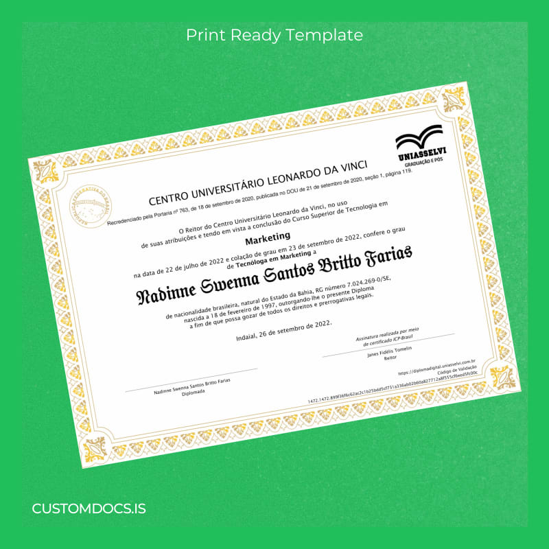 The Brazil Centro Universitário Leonardo da Vinci Technology Degree in Marketing Template – Word & PDF offers a fully editable and print-ready digital document that replicates the original with precision. Designed for marketing professionals and graduates who need a swift and professional diploma replacement, this template is a reliable choice to regain confidence in your academic documentation.