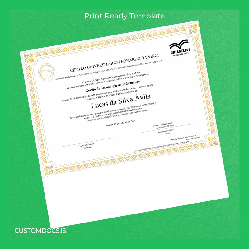 This template addresses the common pain points of losing original diplomas, which often cause delays in job applications, certifications, or further studies. Instead of enduring a lengthy bureaucratic process, use this editable Word & PDF diploma template to ensure your credentials are presented professionally and without compromise. It embodies convenience, quality, and trustworthiness in one package designed specifically for Brazil Centro Universitário Leonardo da Vinci graduates.