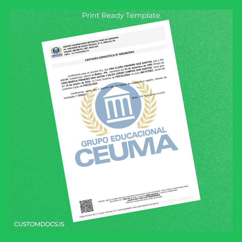 Our Brazil Centro Universitário Metropolitano da Amazônia Bachelor of Psychology Template – Word & PDF offers an immediate, editable solution to replace or customize your diploma effortlessly. Designed for professionals and graduates who need a quick, polished diploma replica, this template provides a user-friendly, print-ready format that can be personalized within minutes.