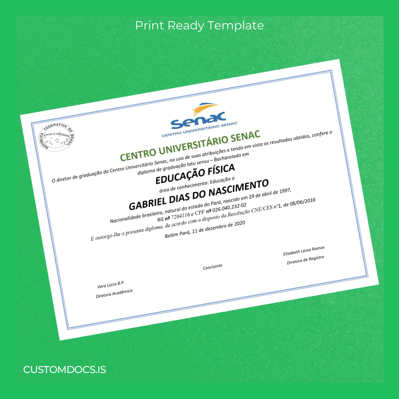 Introducing the Brazil Centro Universitário Senac Bachelor of Physical Education Diploma Template – Word & PDF, a digital diploma download crafted for immediate use. This customizable degree template offers a practical and professional alternative to traditional bureau processes, enabling seamless editing and printing at your convenience.