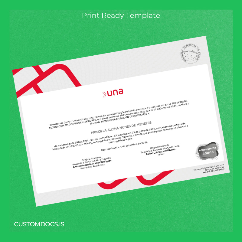 Download the Brazil Centro Universitário UNA Technology in Interior Design Diploma Template – Word & PDF