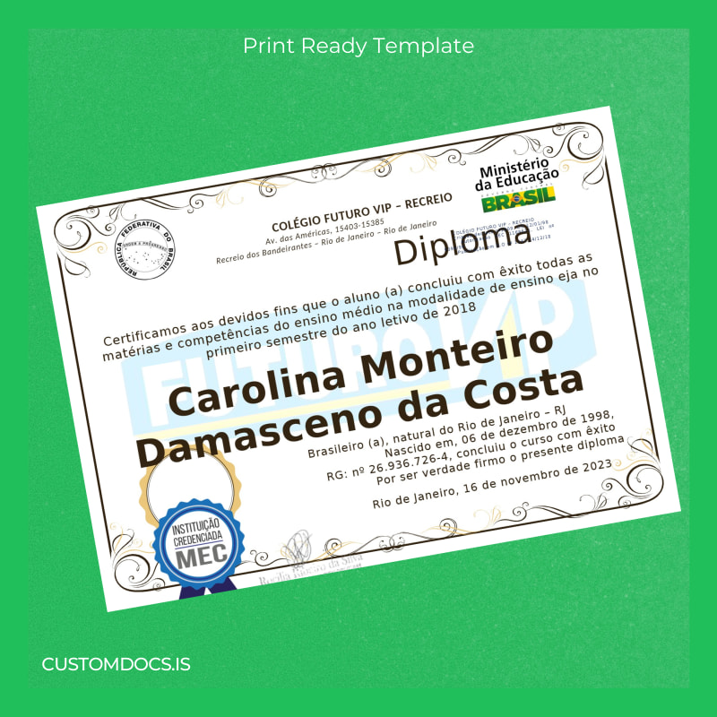 - Designed specifically for Brazil Colégio Futuro VIP High School graduates needing quick, quality diploma replacements