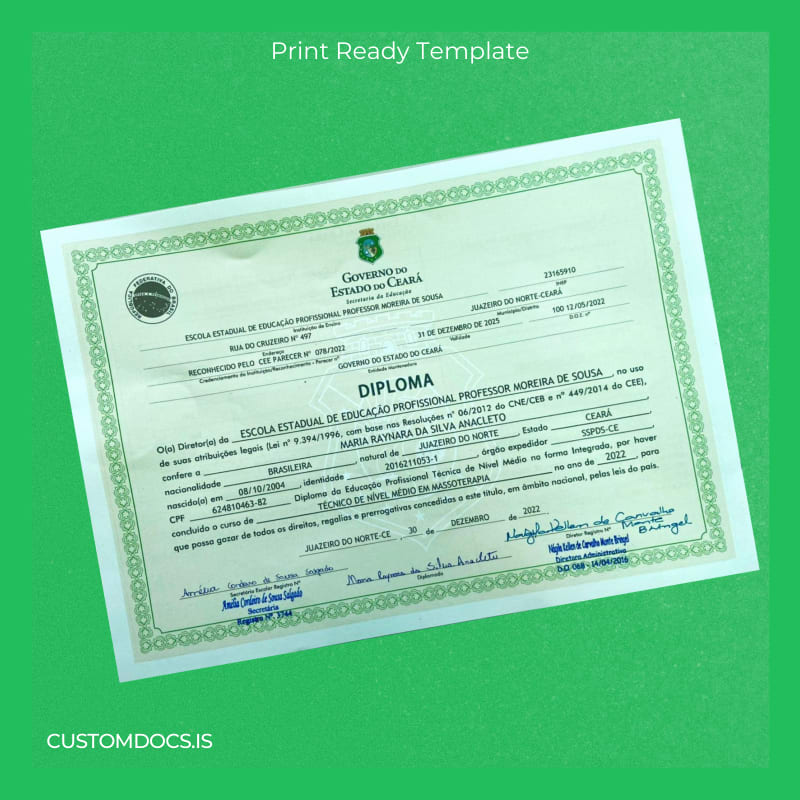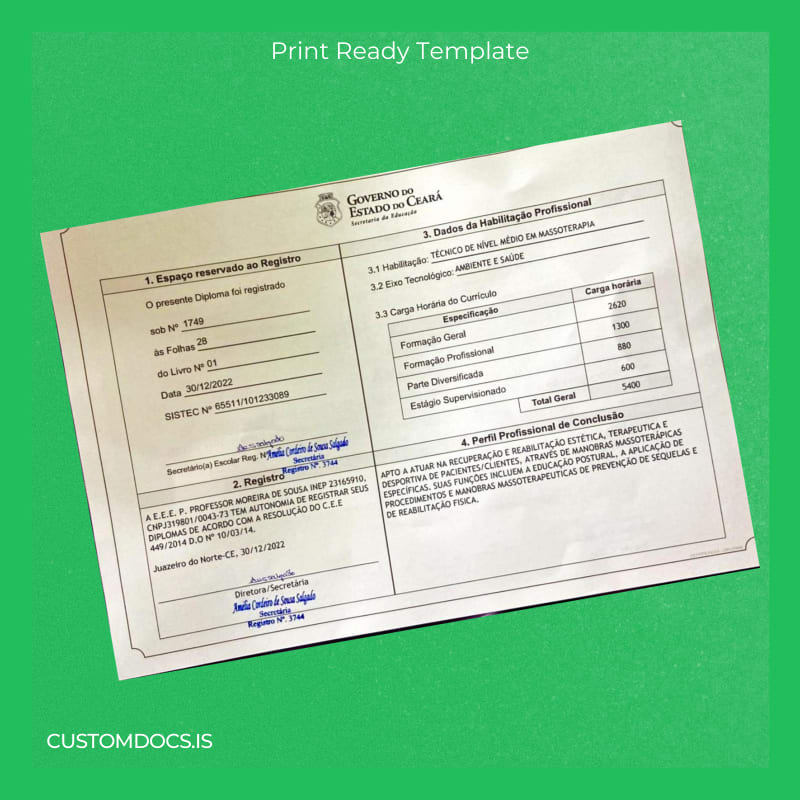 The Brazil Escola Estadual de Educacao Profissional Professor Moreira de Sousa Technical Diploma in Massage Therapy Template – Word & PDF offers an editable and customizable diploma design that empowers professionals to recreate their official degree documents instantly. Carefully crafted for massage therapy practitioners, this template facilitates hassle-free modification of all diploma details, ensuring accuracy and authenticity for digital or print use.