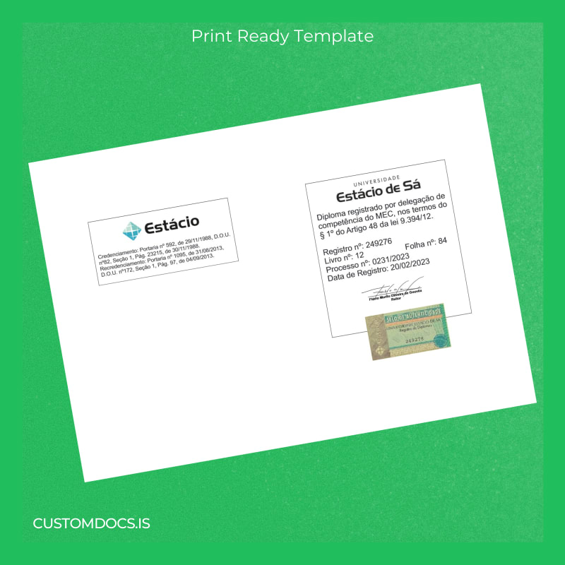 Download Brazil Estácio de Sá Licensed in Pedagogy Diploma Template – Word & PDF – Instant Digital File 2 Page