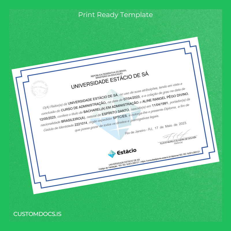 Get the editable Brazil Estácio University Bachelor of Business Administration Diploma Template – Word & PDF for quick, customizable replacement and professional printing.
