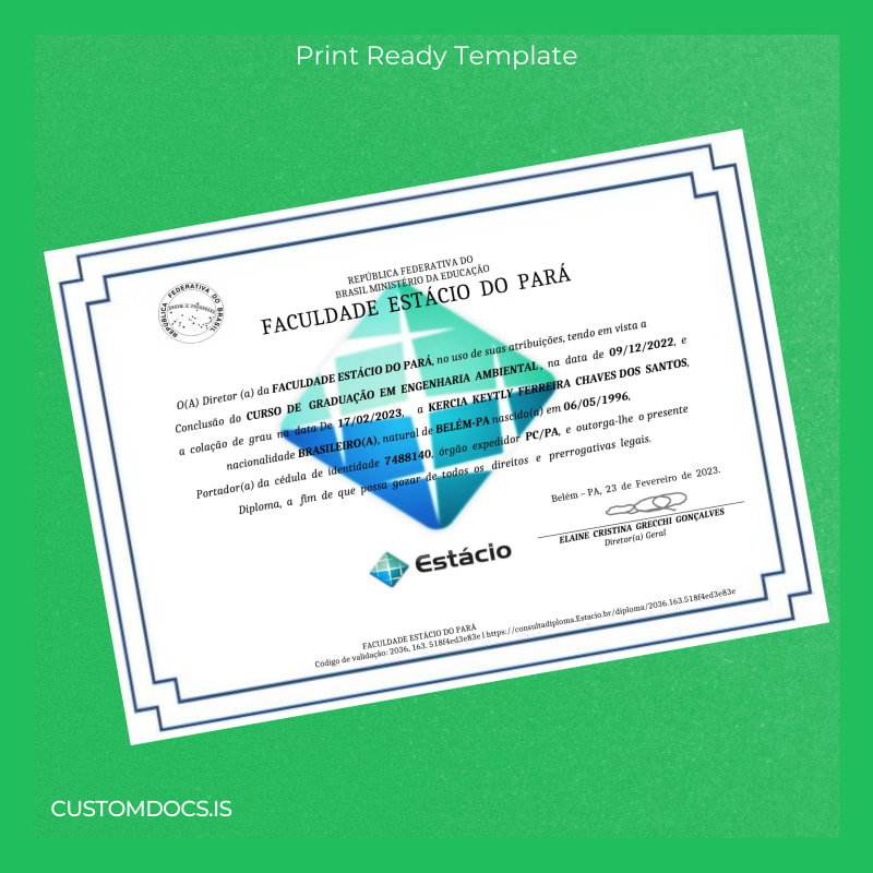 - Professionally designed layout replicating the official diploma style of Brazil Estácio University.