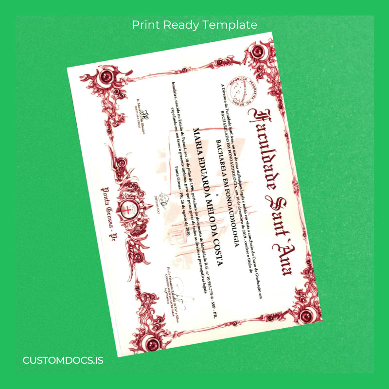 The Brazil Faculdade Sant’Ana Bachelor in Speech-Language Pathology Template – Word & PDF is your optimal choice for an editable, print-ready diploma that streamlines document replacement. Designed thoughtfully with high-resolution graphics and vector layers, this template provides flawless print quality suitable for professional use.