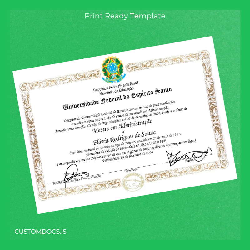Download the editable, customizable Brazil Federal University of Espírito Santo Master of Business Administration Template – Word & PDF for quick professional diploma replacement.