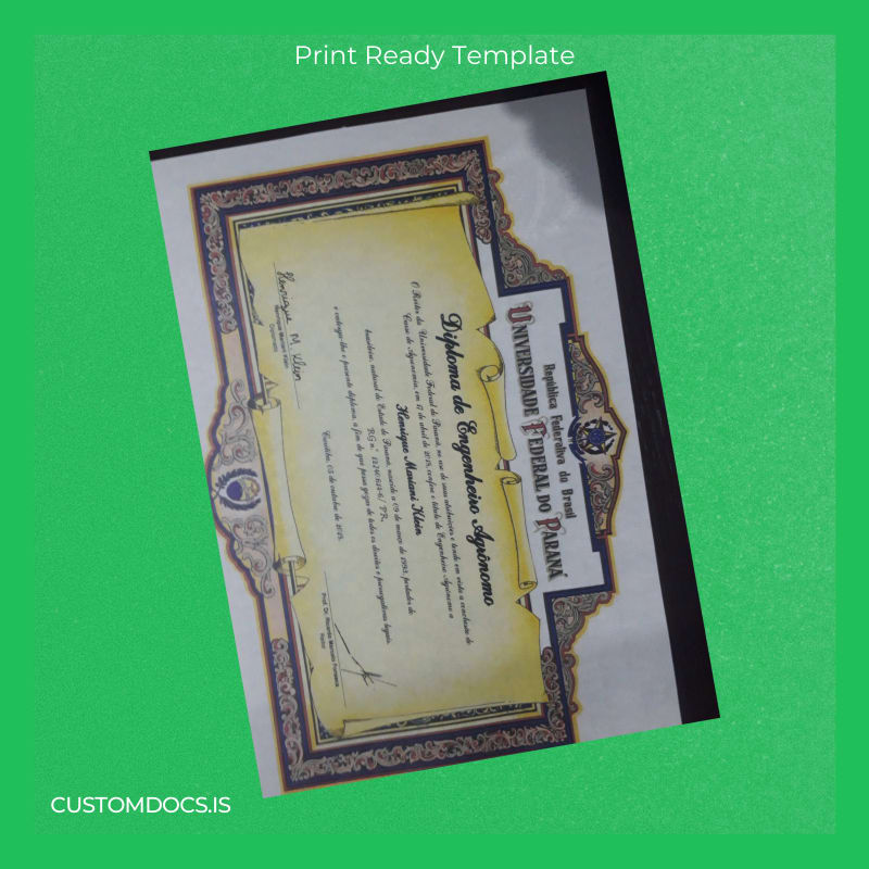 Ease your worries with the Customizable Degree Template specifically designed for the Brazil Federal University of Paraná Bachelor of Science in Agricultural Engineering. This instantly downloadable Word and PDF template provides an editable diploma solution that’s both authentic in design and simple to customize. Replace your diploma record quickly with a pristine format that meets professional standards and impresses stakeholders.