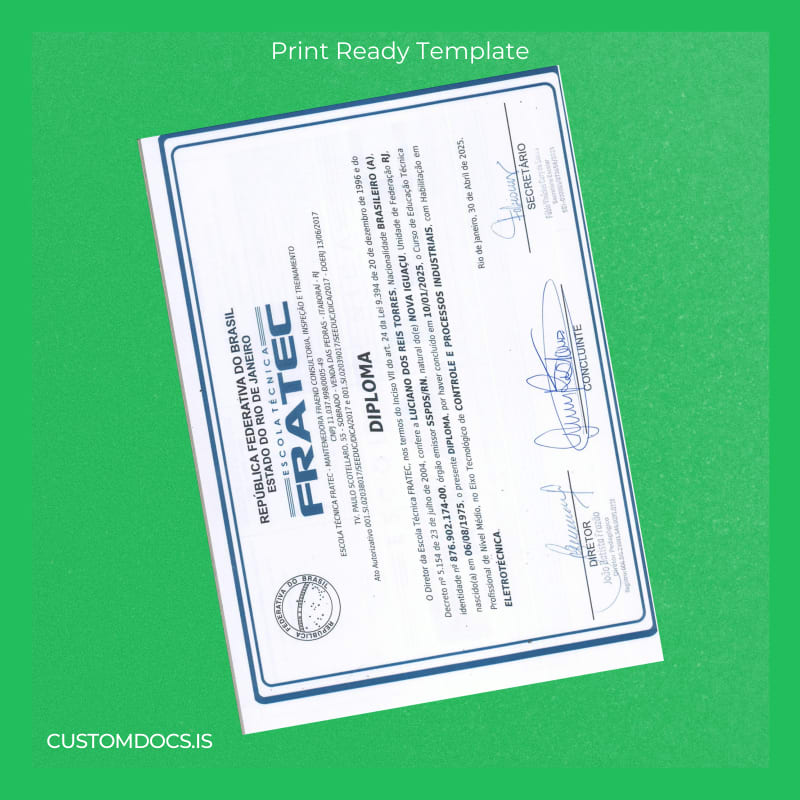 The Brazil FRATEC Diploma in Electrical Engineering Template – Word & PDF offers an immediate, easy-to-use digital solution designed to replace your essential credential without delay. This customizable degree template ensures that you can swiftly recreate a professional-quality diploma that meets your needs. Perfect for individuals requiring a blank diploma form or a replacement diploma template, this design is crafted to be both visually authentic and straightforward to edit.