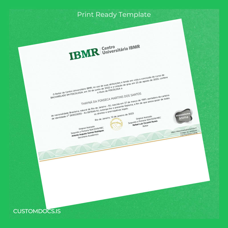 Instant Editable Diploma Template for Brazil IBMR University Center Psychology Graduates