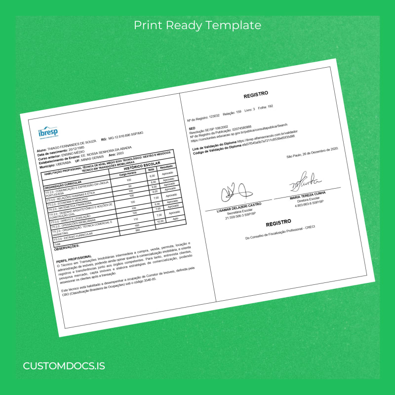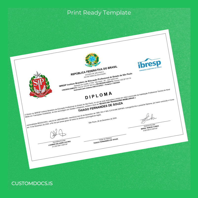 Losing your technical real estate diploma or facing the urgent need for a replacement can create significant stress. The bureaucratic hurdles and long waiting times for official documents may cause missed opportunities or deadlines. Fortunately, the Brazil IBRESP Instituto Brasileiro de Educação Profissional Técnico em Transações Imobiliárias Diploma Template – Word & PDF provides an immediate, user-friendly solution designed to ease these challenges.