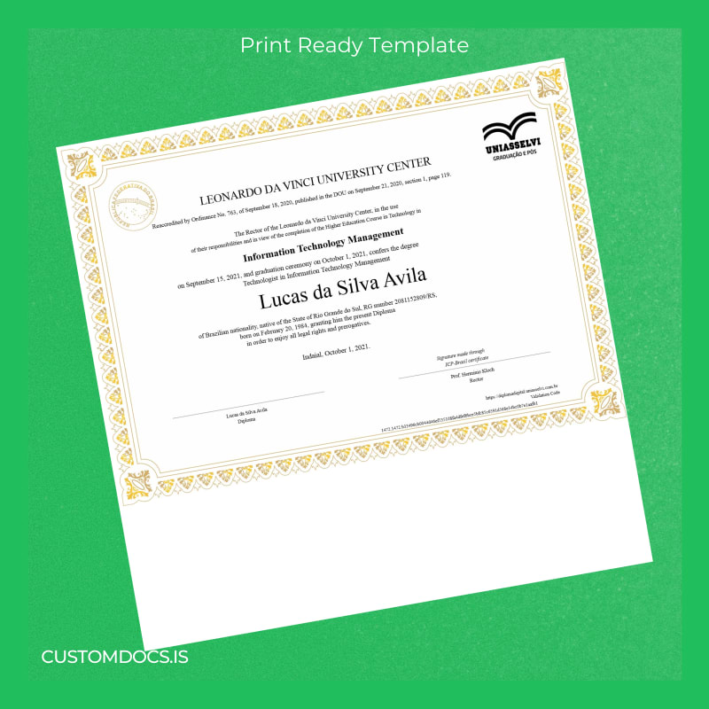 Instant Editable Diploma Template for Brazil Leonardo da Vinci University Center Technologist in Information Technology Management