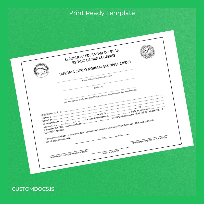 Lost your vital educational certificate or urgently need a replacement? The frustration and delay of bureaucratic processes can severely impact your professional and academic progress. Avoid long waiting times and bureaucratic hurdles with our Brazil Minas Gerais State Diploma Normal Course at High School Level Certificate Template – Word & PDF, designed for effortless customization and instant access.