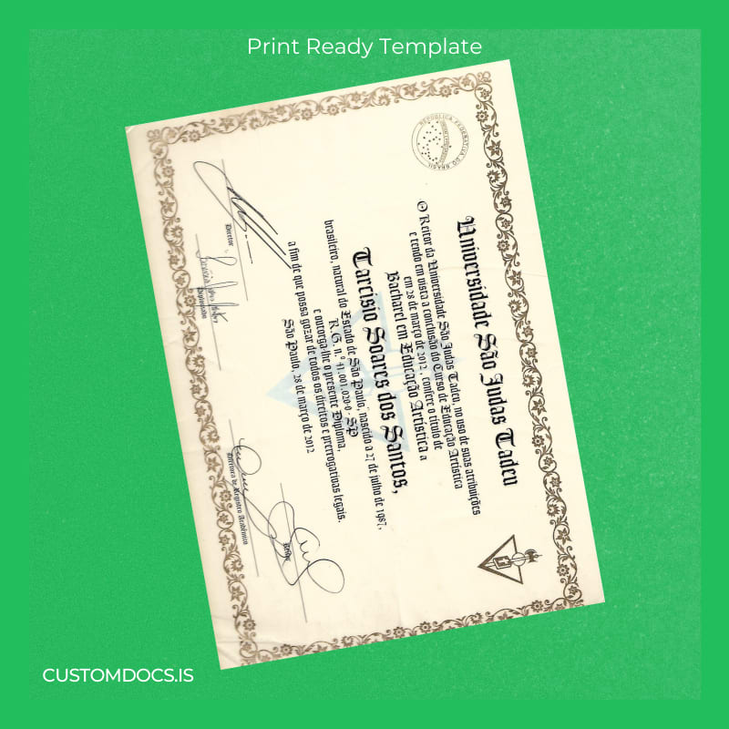 Eliminate the hassle with the Brazil Tarcisio University Diploma Template – Word & PDF, designed to provide a quick, professional, and editable diploma solution. This customizable degree template allows you to generate a precise replica suitable for various official or novelty uses. It’s a reliable digital diploma download crafted for professionals who require efficient document recreation.