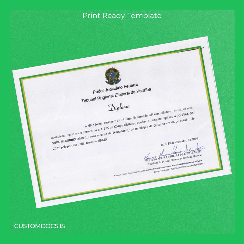 The Brazil Tribunal Regional Eleitoral da Paraíba Diploma Template – Word & PDF is an instantly accessible, editable diploma template designed for professionals who need to replace or customize their diplomas without delay. Perfect for those facing urgent document requirements, this customizable degree template offers a seamless experience devoid of administrative hassles. Whether you are updating details or recreating a lost credential, this blank diploma form ensures professional results with minimal effort. Explore more options at our customizable degree template category.