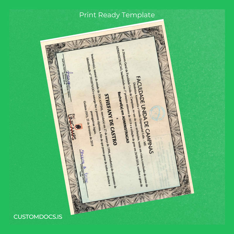 The Brazil UNICAMP Bachelor of Administration Template – Word & PDF is your immediate and professional answer. This expertly crafted template is fully editable, allowing you to customize every detail to match original document requirements perfectly. Designed for ease of use and high-quality results, it provides an efficient solution for those needing a replacement or a novelty diploma.