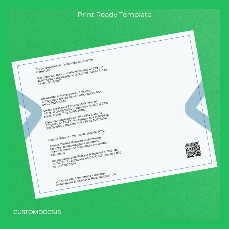 This customizable degree template offers a professional, editable, and print-ready format designed specifically to replicate the look and feel of the authentic diploma from Brazil Universidade Anhanguera – Uniderp. Crafted for ease of use, it empowers professionals to quickly produce a high-quality document that meets personal and business needs in an instant.