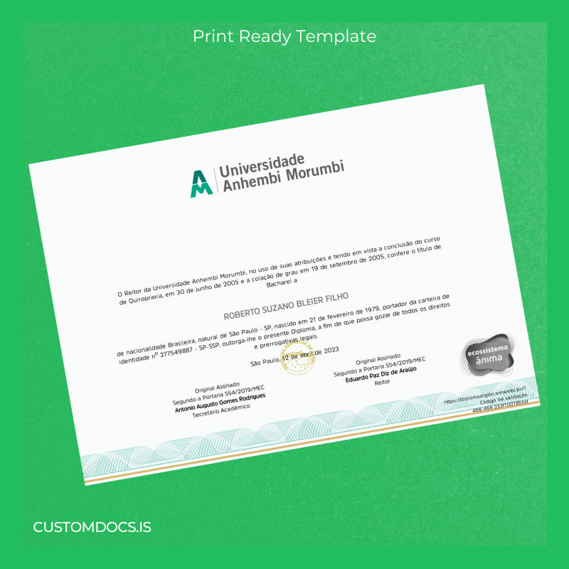 The Brazil Universidade Anhembi Morumbi Bachelor of Chiropractic Degree Template – Word & PDF offers an immediate, user-friendly remedy. This fully editable and print-ready template allows professionals to customize their diploma details effortlessly and generate a high-quality replacement or novelty diploma swiftly. Tailored to meet the requirements of chiropractic degree documentation, it supports the urgent need for professional credential management.