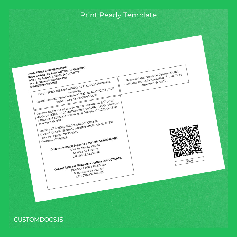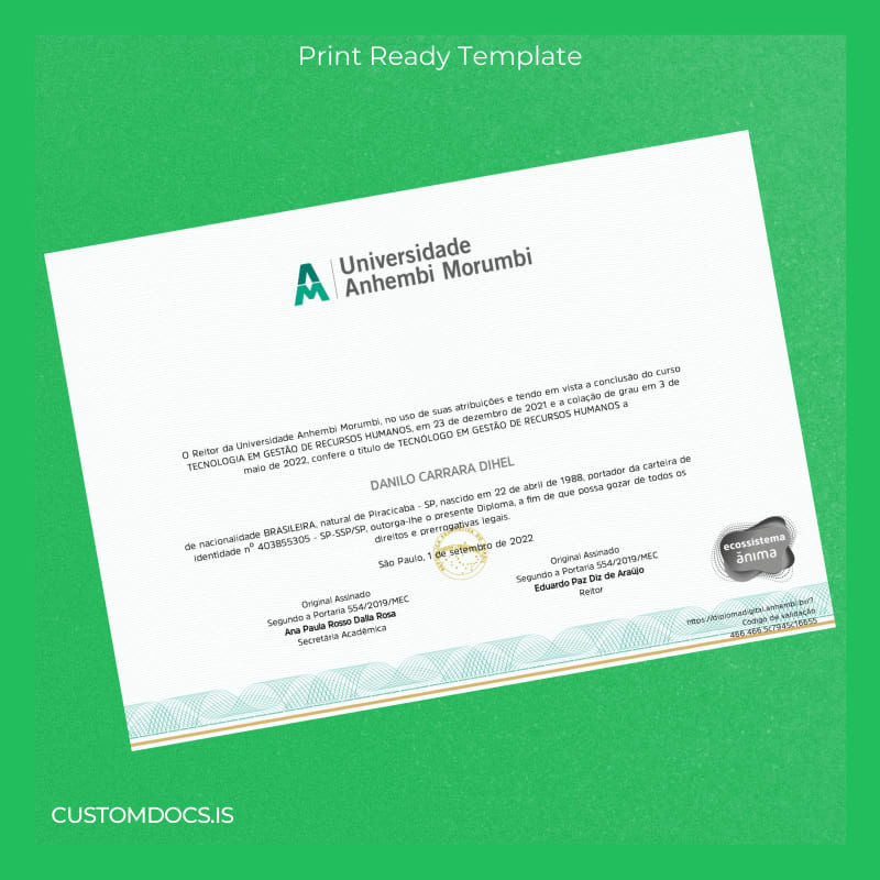Introducing the Brazil Universidade Anhembi Morumbi Tecnólogo em Gestão de Recursos Humanos Template – Word & PDF, the perfect solution for professionals who require immediate access to a high-quality, editable diploma form. Designed with convenience in mind, this template allows you to effortlessly customize all details to match your original document, ensuring authenticity and professional appearance.