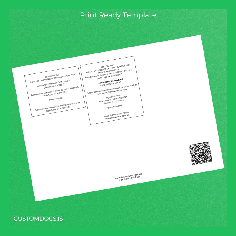This replacement diploma template addresses the critical need for an official-looking document when original certificates are misplaced or damaged. It mitigates legal and procedural difficulties, helping you maintain your career trajectory without interruptions. Take control of your professional documentation today with a blank diploma form crafted specifically for Brazil Universidade da Amazônia graduates.