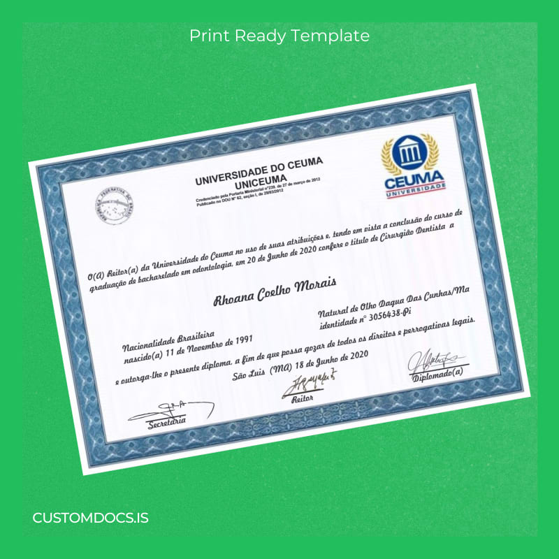 Introducing the Brazil Universidade do Ceuma Bachelor of Dentistry Diploma Template – Word & PDF, a fully editable and customizable solution designed to provide immediate access to a professional diploma replica. This digital diploma download offers an easy-to-use, blank diploma form that allows you to personalize essential details rapidly, avoiding prolonged delays.