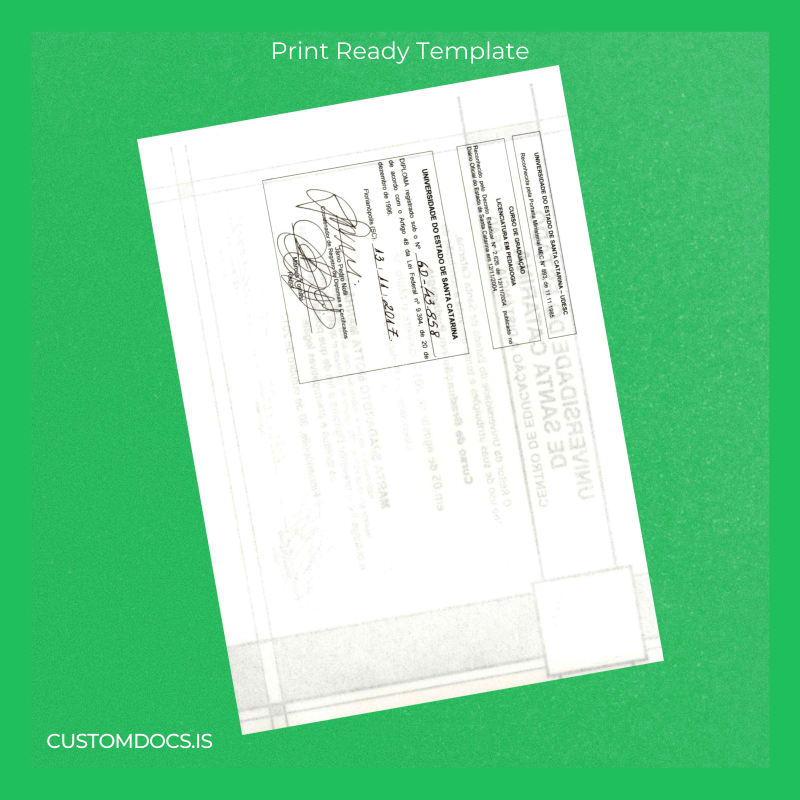 Our Customizable Degree Template for the Brazil Universidade do Estado de Santa Catarina Bachelor’s Degree in Education offers an immediate digital solution. Designed for ease of use, this template is fully editable and customizable, allowing you to recreate a professional-looking diploma in minutes using popular Word and PDF editors.