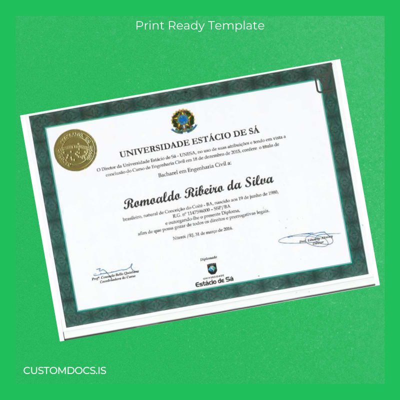 Introducing the Brazil Universidade Estadual de Sá Bachelor of Civil Engineering Template – Word & PDF, expertly designed as a replacement diploma template that is both editable and print-ready. This customizable degree template allows you to personalize every detail—name, date, and other key information—quickly and efficiently. Available in Word and PDF formats, the template ensures seamless editing and immediate download, catering to urgent requirements.