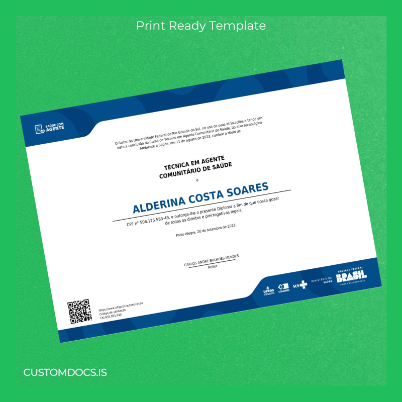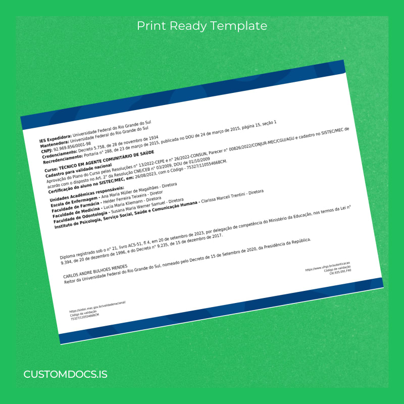 Our Customizable Degree Template for the Brazil Universidade Federal do Rio Grande do Sul Technical Diploma in Community Health Agent offers a streamlined, editable, and print-ready solution. This digital diploma template is designed for professionals who require an accurate, high-quality replacement diploma quickly and efficiently.