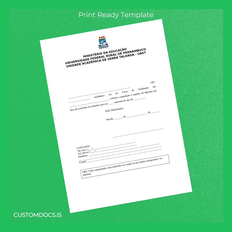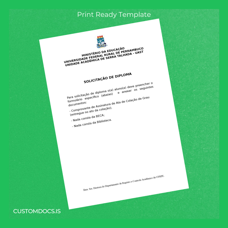 Our Customizable Degree Template for the Brazil Universidade Federal Rural de Pernambuco UAST Diploma Request Template – Word & PDF is designed to provide a fast and professional way to obtain a replacement diploma digitally. This template offers complete editability allowing users to modify every detail, ensuring a perfect replica aligned with official standards.