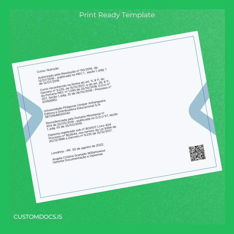 The Brazil Universidade Pitágoras Bachelor of Nutrition Diploma Template – Word & PDF provides a seamless, editable solution for recreating your diploma promptly. This customizable degree template lets you professionally personalize and print your diploma, fulfilling urgent replacement needs without compromising authenticity or quality. For additional options, explore our customizable degree template collection.