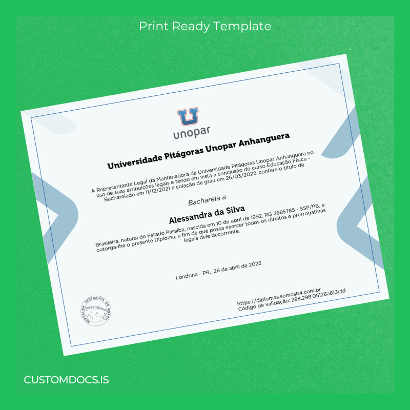 Our Brazil Universidade Pitágoras Unopar Anhanguera Bachelor of Physical Education Template – Word & PDF is designed as a fully editable and print-ready replacement diploma. Tailored specifically for professionals seeking an immediate and authentic digital solution, this template allows you to personalize every detail with ease. Whether you need to amend names, dates, or official seals, this document offers unparalleled flexibility.