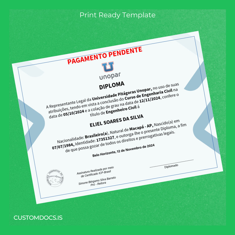 Don’t let the frustration of waiting hold you back. With the customizable degree template specially designed for the Brazil Universidade Pitágoras Unopar Bachelor of Civil Engineering, you can instantly recover a professional-quality diploma that suits your urgent needs.