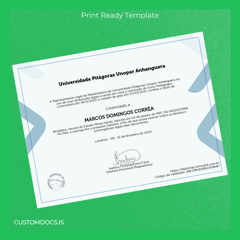 Editable and customizable Brazil Universidade Pitágoras Unopar Bachelor of Education in Pedagogy Template – Word & PDF for instant replacement diplomas.
