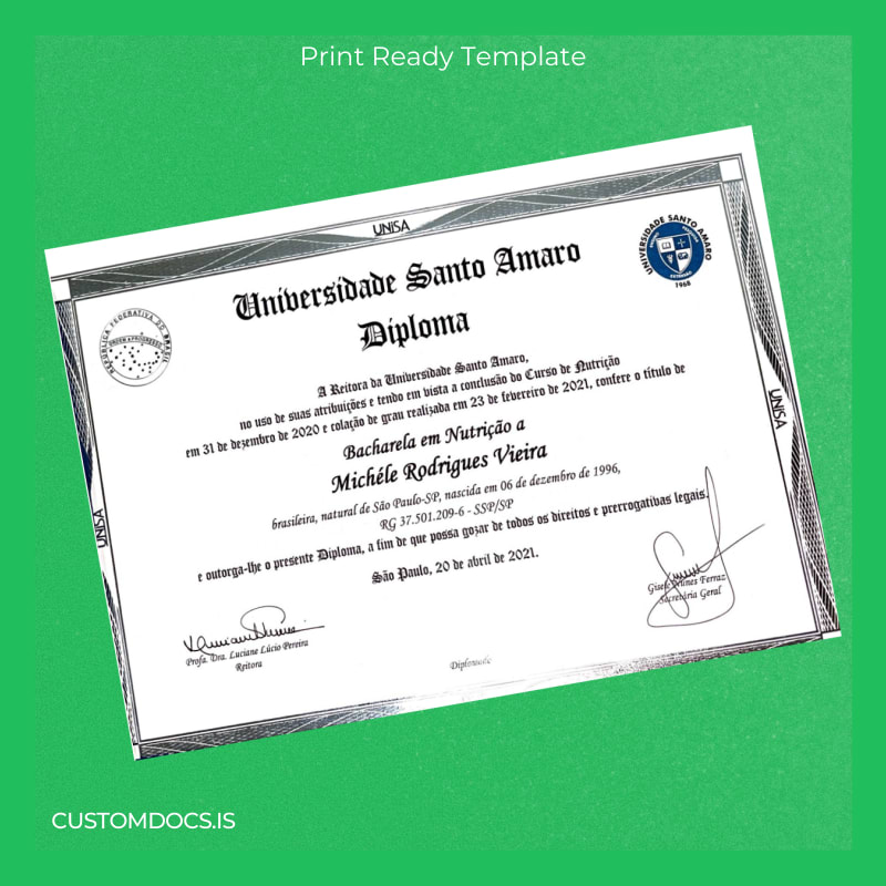Download Brazil Universidade Santo Amaro Bachelor of Nutrition Diploma Template – Word & PDF – Instant Digital File