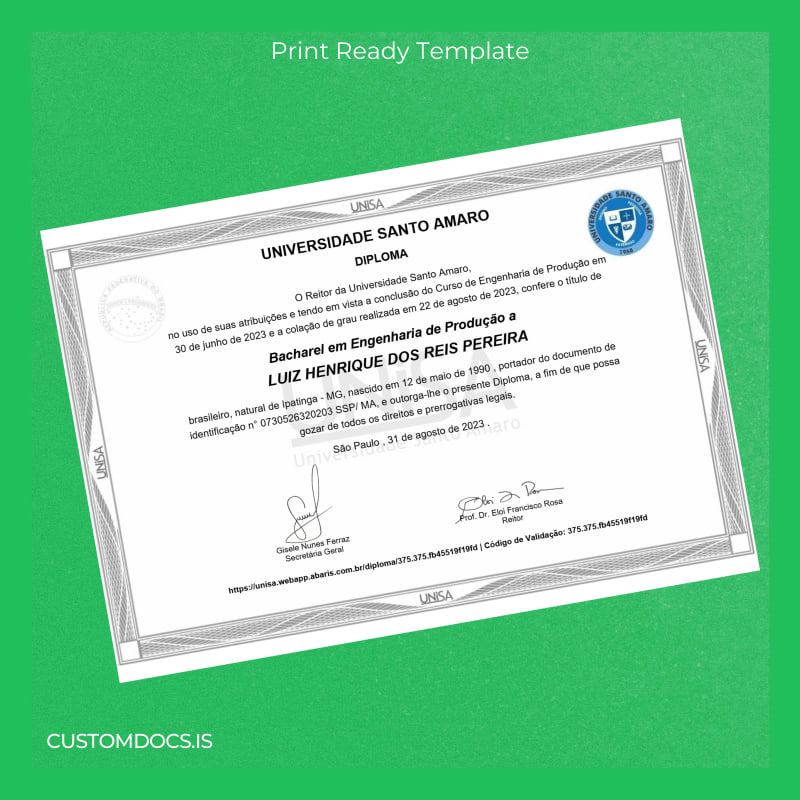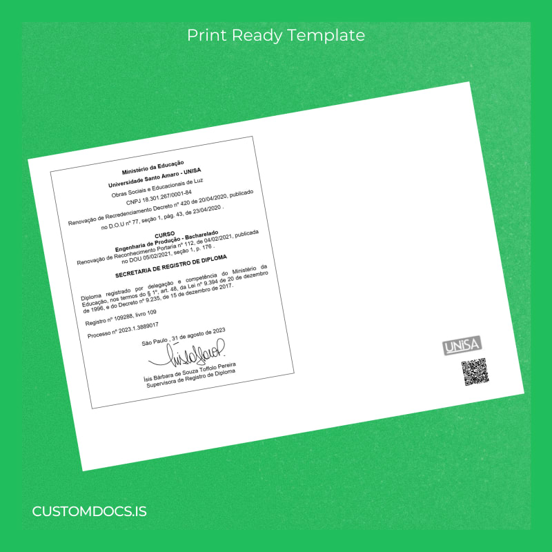 The Brazil Universidade Santo Amaro Bachelor of Production Engineering Template – Word & PDF offers a seamless, customizable degree template designed to provide an instant, editable, and print-ready alternative for your diploma needs. Tailored for professionals requiring a fast and reliable replacement, this template is perfect for those who have misplaced their original document or need a high-quality novelty diploma design.
