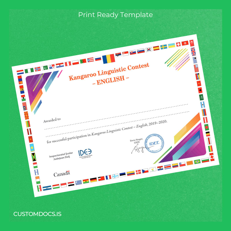 Download Canada Institute for Educational Development Kangaroo Linguistic Contest Award Certificate Template – Word & PDF – Instant Digital File