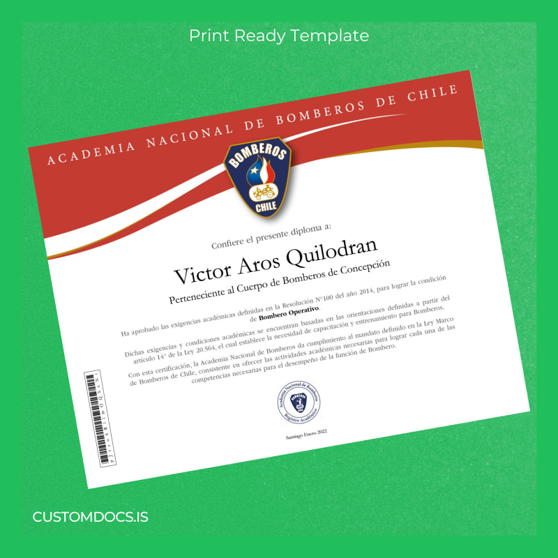 Download Chile Academia Nacional de Bomberos Operative Firefighter Diploma Template – Word & PDF – Instant Digital File