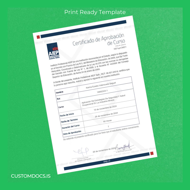 Editable Chile AIEP Professional Institute Diploma in Application of Security and Occupational Health Strategies in the Mining Industry Template – Word & PDF. Customize now!