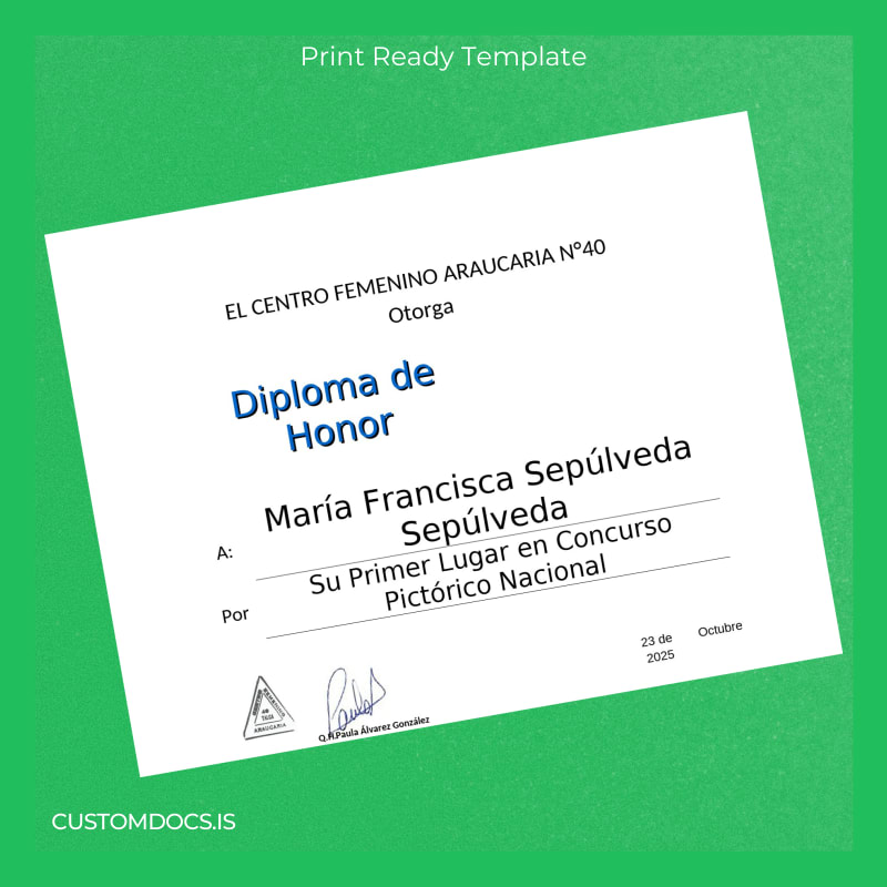 Download Chile El Centro Femenino Araucaria N°40 Diploma of Honor Template – Word & PDF – Instant Digital File 2 Page