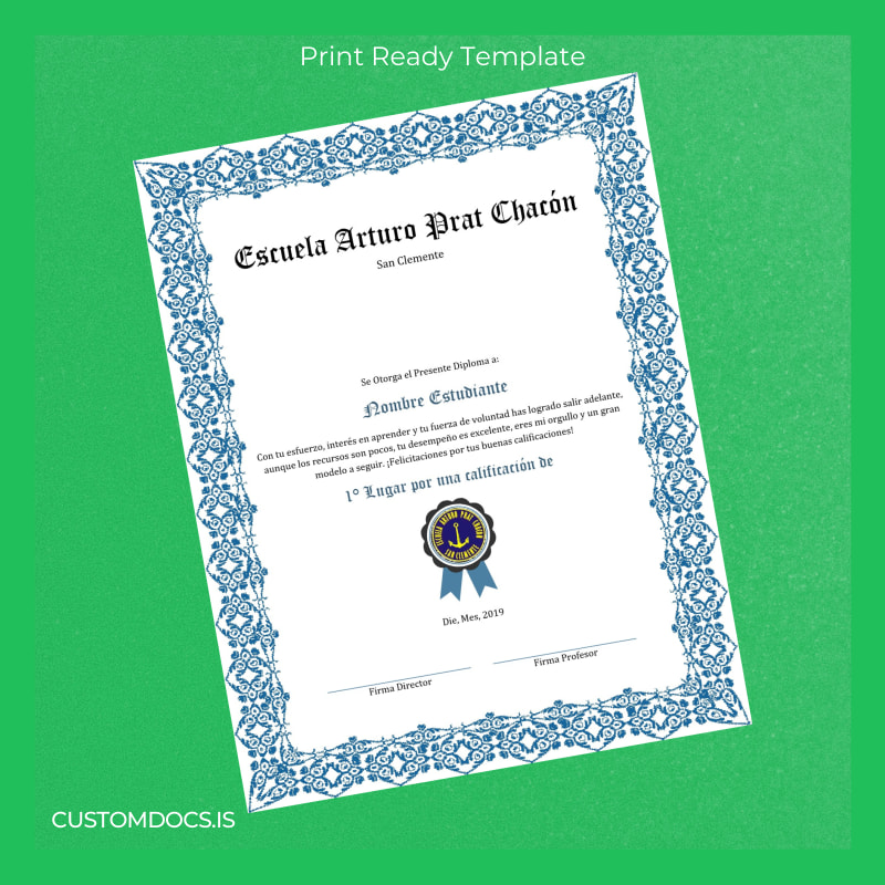 Instant Editable Diploma Template for Chile Escuela Arturo Prat Chacón High School Graduates