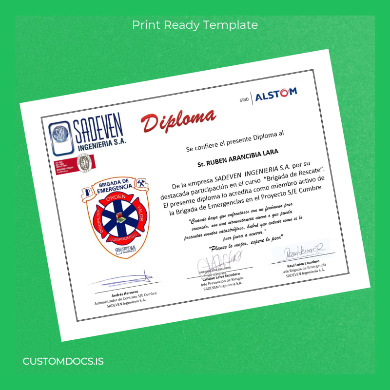 The Chile Sadeven Ingenieria S.A. Emergency Brigade Diploma Template – Word & PDF is crafted to serve as your immediate, high-quality alternative. This digital diploma download offers unparalleled convenience with fully editable document fields, enabling you to personalize every detail swiftly and accurately.