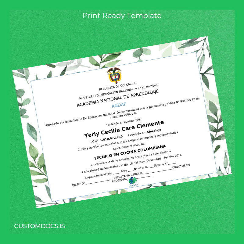Editable and customizable Colombia Academia Nacional de Aprendizaje Técnico en Cocina Colombiana Template – Word & PDF for instant professional diploma replacement.