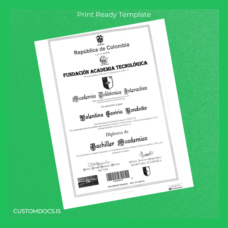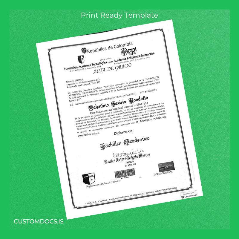The Colombia Academia Politécnica Interactiva Bachiller Academic Diploma Template – Word & PDF is your instant, print-ready solution designed for professionals who require an easily editable and professional diploma format. Whether you need to quickly replace a lost diploma or desire a pristine certificate for presentation, this template adapts perfectly to your needs with full customization options.