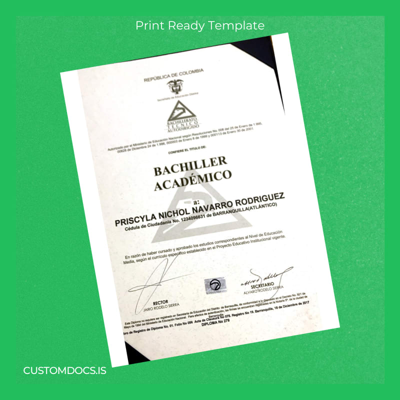The Colombia Barranquilla Technical High School Academic Bachelor Certificate Template – Word & PDF offers an efficient, editable, and printable resolution. Designed for professionals needing immediate documentation, this customizable diploma template facilitates seamless certificate recreation with professional precision. Perfect for quick replacement or presentation, it ensures compliance with official standards and personalization to your exact requirements.