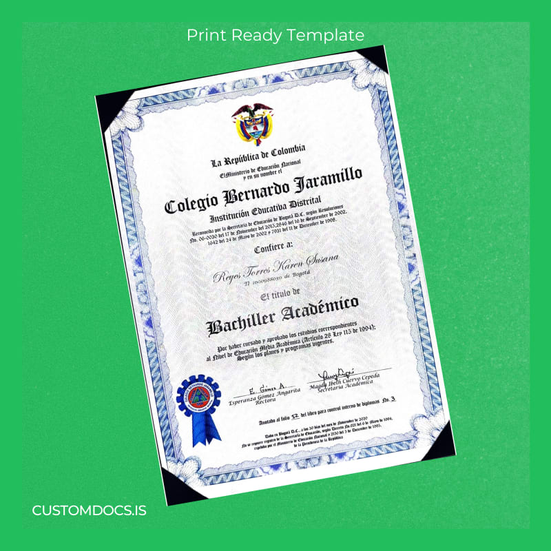 Our Colombia Colegio Bernardo Jaramillo High School Diploma Template – Word & PDF offers an instant digital download that puts you in control. This editable diploma template is designed for individuals requiring a fast, accurate, and professional diploma substitute that closely aligns with the original document’s appearance.