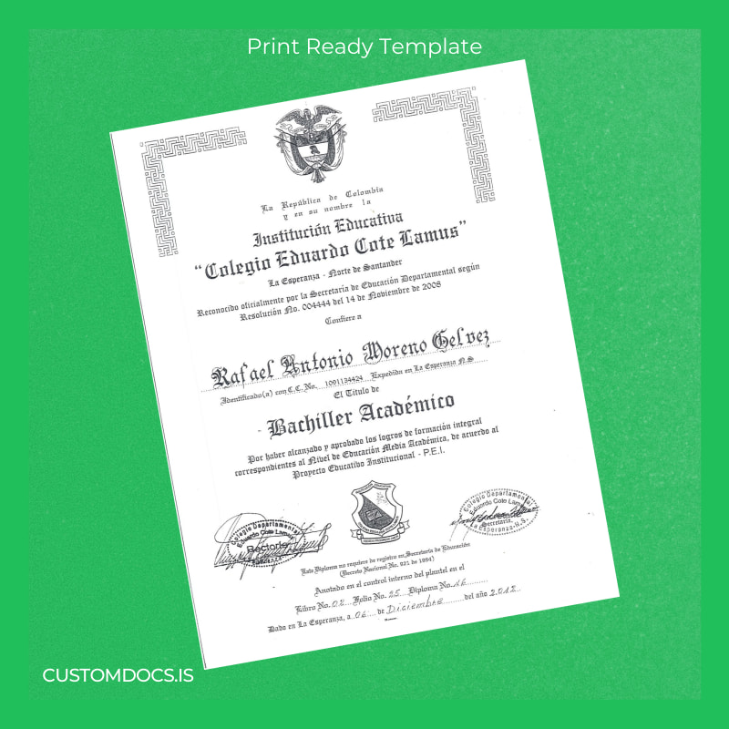 The Colombia Colegio Eduardo Cote Lamus Bachelor of Academic Studies Template – Word & PDF is your ideal remedy for quick, editable diploma creation. This customizable degree template allows you to seamlessly modify all essential fields, ensuring your digital diploma download matches your personal and professional needs with perfection.
