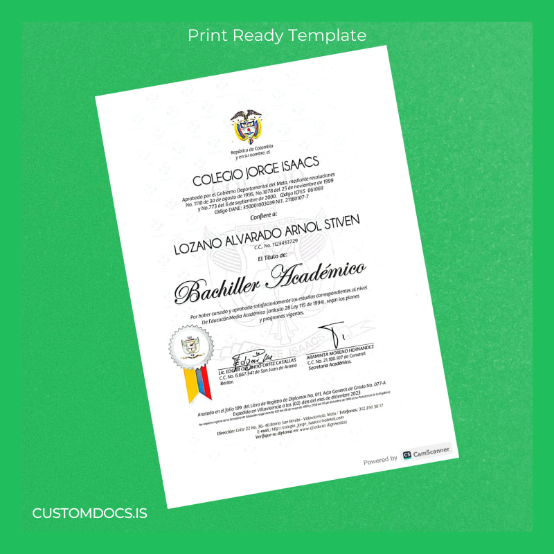 - Includes required official fonts and design elements explicitly authentic to Colombia Colegio Jorge Isaacs diploma standards.