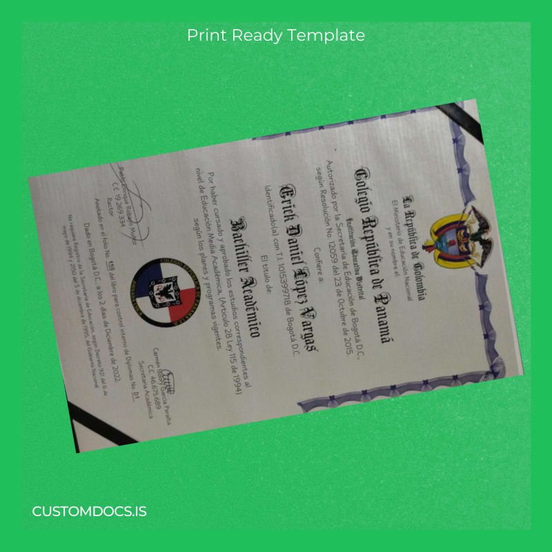 The Colombia Colegio República de Panamá Bachelor Academic Certificate Template – Word & PDF provides a fast, editable, and professionally designed digital diploma download. This fully customizable degree template ensures you can modify all necessary fields, making it ideal as a blank diploma form or replacement diploma template.